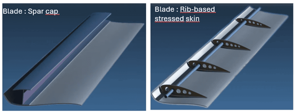 Quelle : Jigsaw Structures. Windturbinenblatt mit Spardeckel-Design (links). Windturbinenblatt mit rippenbasiertem Stresshautdesign (Rechts)